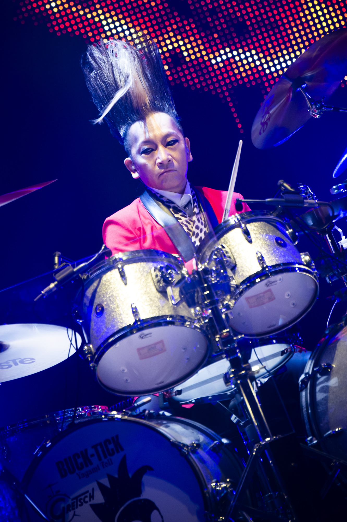 As if acting out the worlds of each song, the singing Sakurai’s performances were brilliant. The sight of him lying down on the floor lit in red during URAHARA-JUKU was breathtakingly beautiful, while the way he folded his arms, as if cradling a child while he swayed to the chilling intro plucked by Hoshino Hidehiko (guitar) was filled with compassion. Right after applying red lipstick himself, he began to sing Maimu Mime, dividing his performance between the man and woman characters with facial expressions and deliberate hand gestures in the backdrop of a drinking district scattered with titles of BUCK-TICK’s old songs on the signboards.